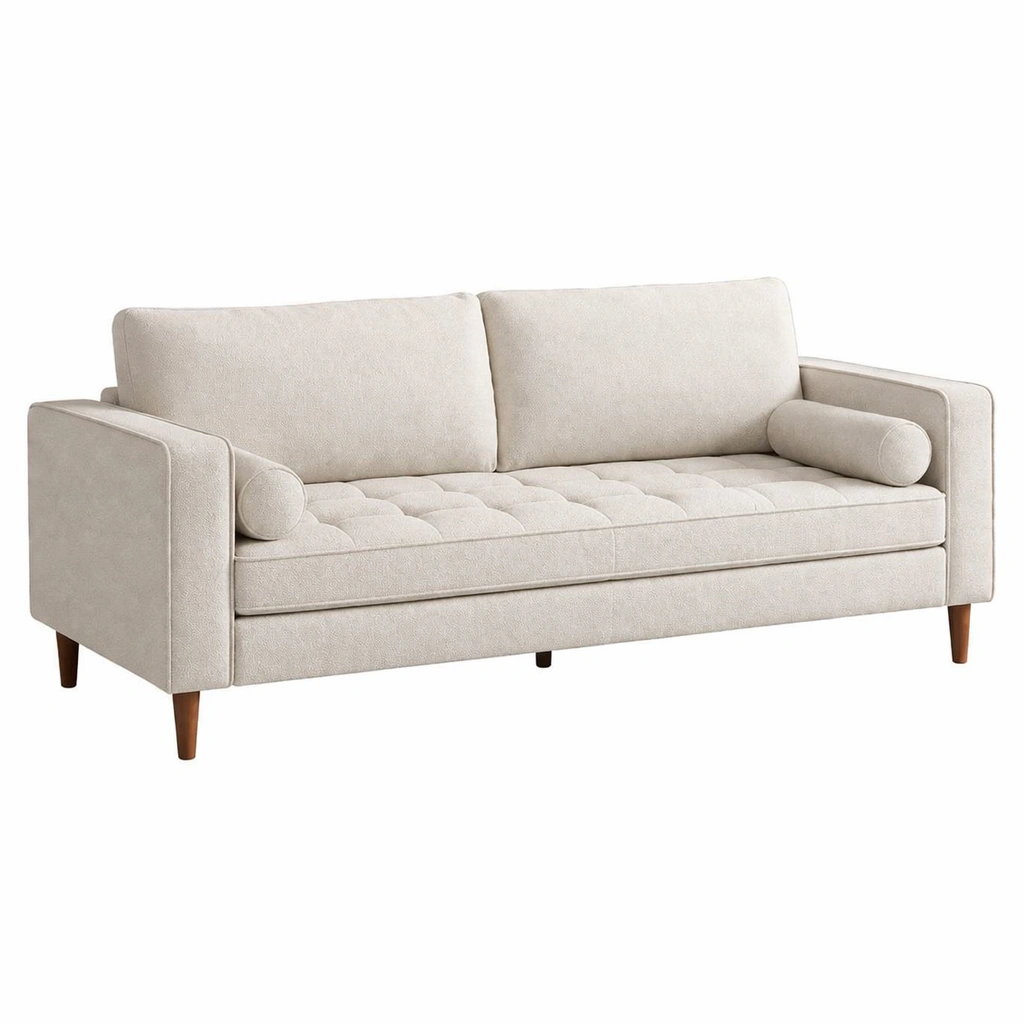 El sofá de dos plazas está tapizado en tela de poliéster y cuenta con patas de madera. Incluye cojines cilíndricos decorativos y un respaldo removible. Las dimensiones son: largo 220 cm, ancho 85 cm, alto 75 cm. El peso total es de 32 kg, y el relleno interior está compuesto de espuma de alta densidad.